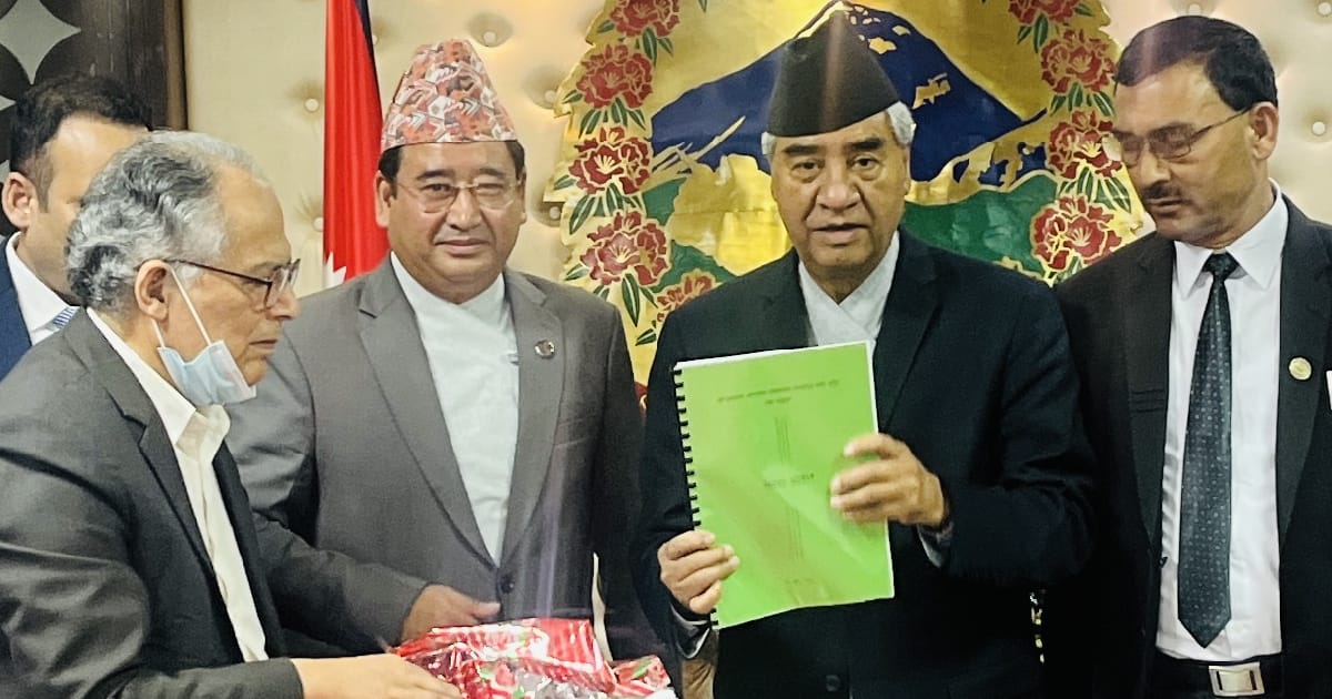 आइतवार बिहान प्रधानमन्त्री निवास बालुवाटारमा आयोजित कार्यक्रममा संस्कृति, पर्यटन तथा नागरिक उड्ययनमन्त्री जीवनराम श्रेष्ठको उपस्थितिमा विज्ञ समूहका संयोजक बीरेन्द्रबहादुर देउजाले प्रधानमन्त्री देउवालाई अध्ययन प्रतिवेदन हस्तान्तरण गरेका हुन् ।