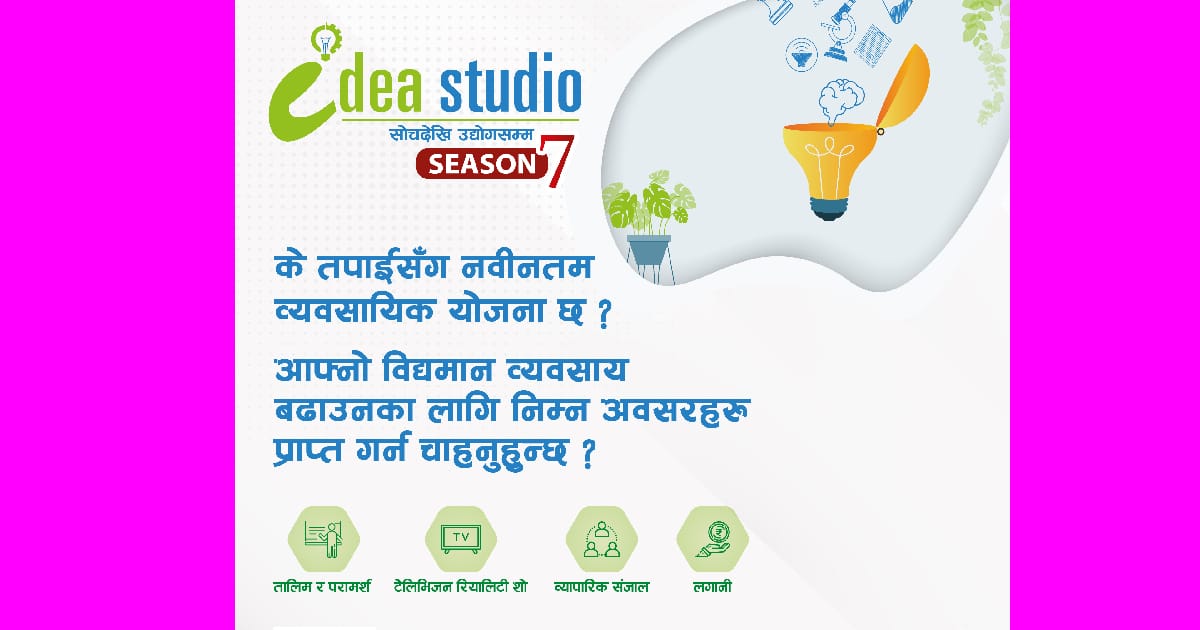 काठमाडाैं । उद्यमशिलतालाई प्रवर्द्धन गर्दै आएको आइडिया स्टुडियो नेपालले आफ्नो साताैँ सिजनको लागि आवेदन खुल्ला गरेको छ | आइडिया स्टुडियोले आफ्नो छैटाैँ सिजन सम्म ४ हजार ५ सयभन्दा बढी नवीन व्यवसायिक विचारहरू प्राप्त गरेको थियाे ।