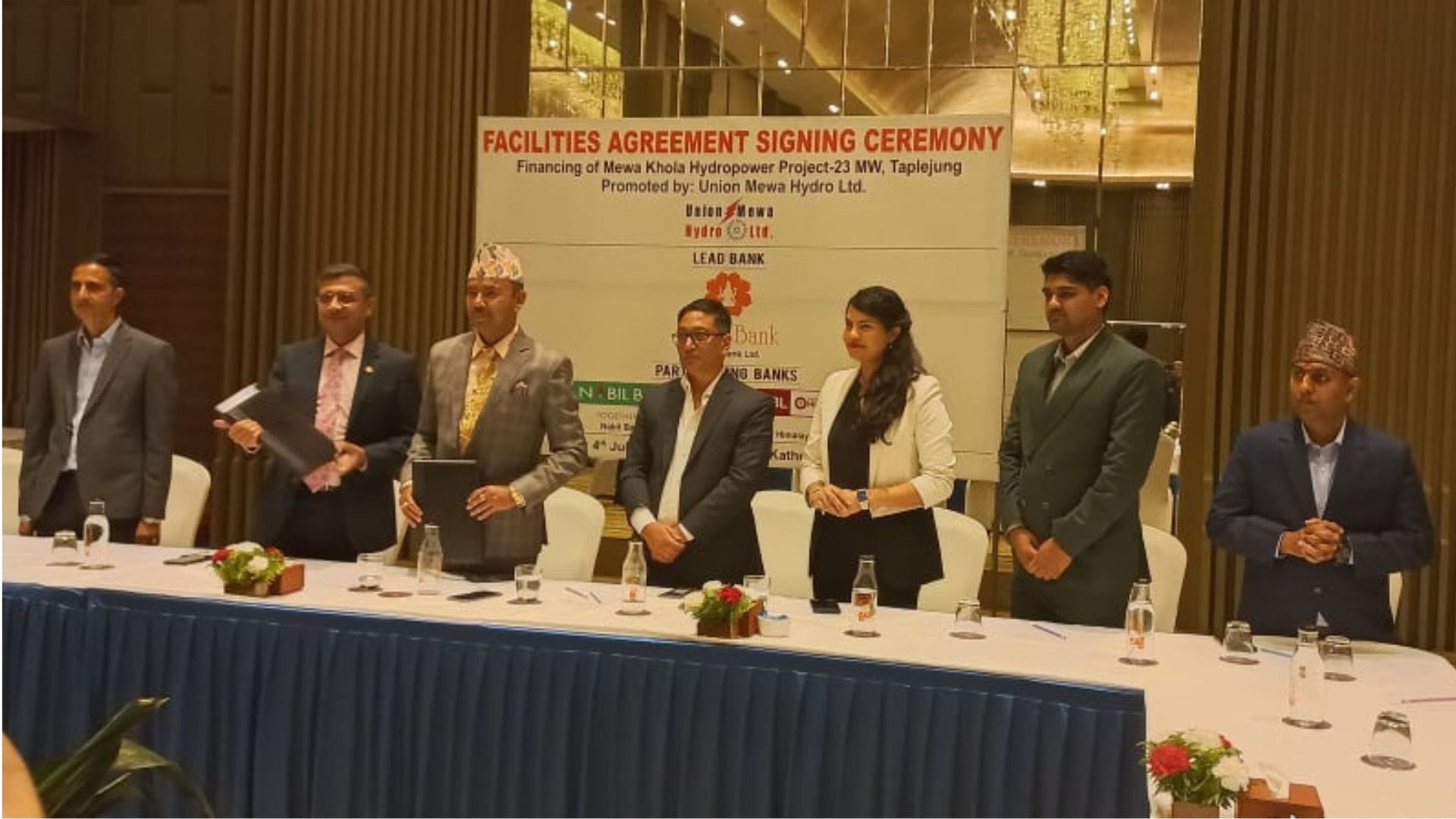 प्रवद्र्धक युनियन मेवा हाइड्रोपावर कम्पनी र लगानी गर्ने बैंकहरूबीच मंगलबार आयोजनाको वित्तीय व्यवस्थापन सम्झौतामा हस्ताक्षर भएको छ । वित्तीय व्यवस्थापन सम्झौतामा कम्पनीका अध्यक्ष किरण मल्ल तथा अगुवाई गर्ने लक्ष्मी बैंकका डेपुटी प्रमुख कार्यकारी अधिकृत सुमित भट्टराईले हस्ताक्षर गरेका छन् ।