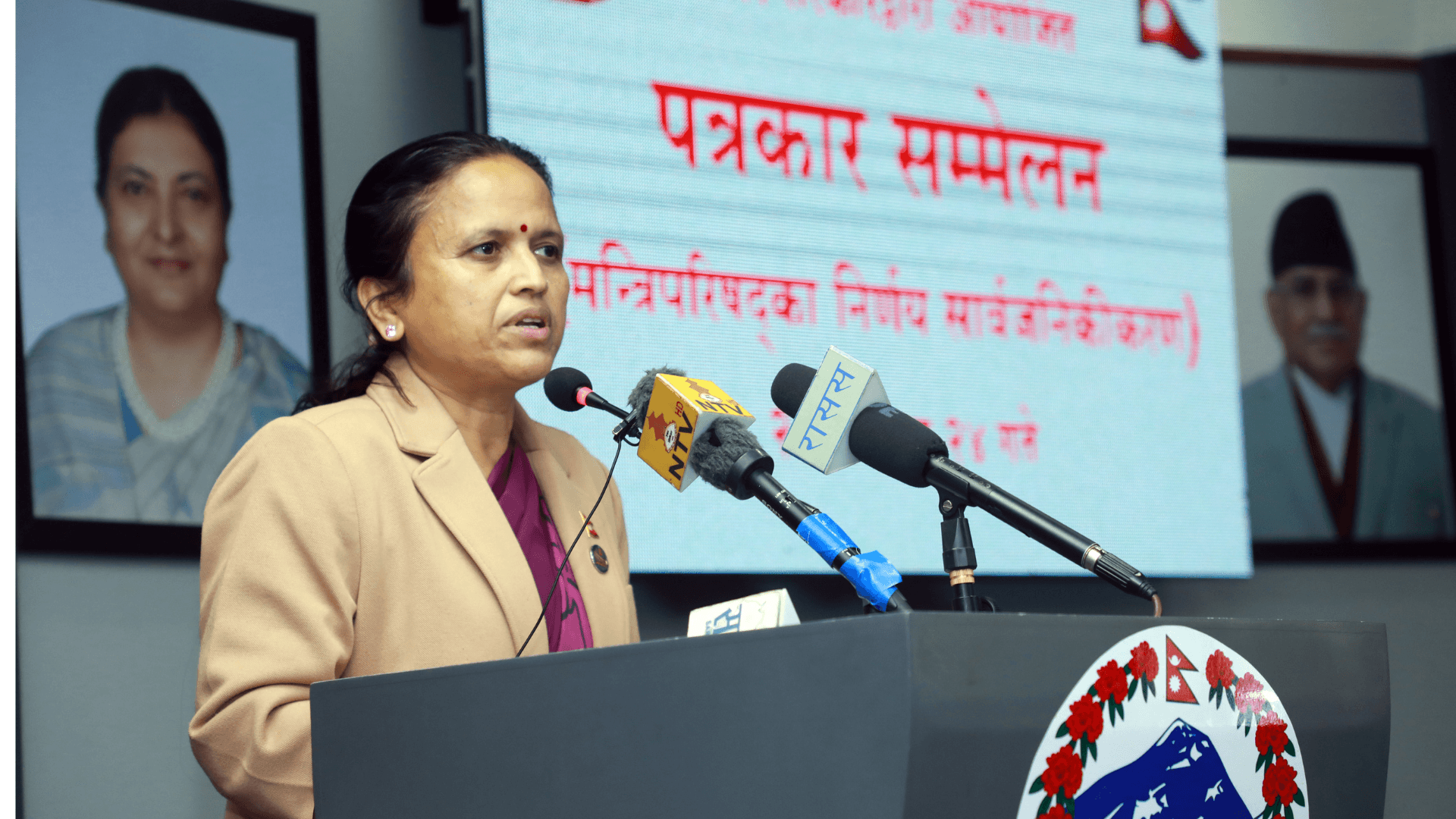 मन्त्रिपरिषद्को यही कात्तिक २३ गते बसेको बैठकको निर्णय सार्वजनिक गर्न आज सञ्चार तथा सूचना प्रविधि मन्त्रालयमा आयोजित पत्रकार सम्मेलनमा सरकारका प्रवक्ता एवं सञ्चारमन्त्री रेखा शर्माले जानकारी दिइन् ।