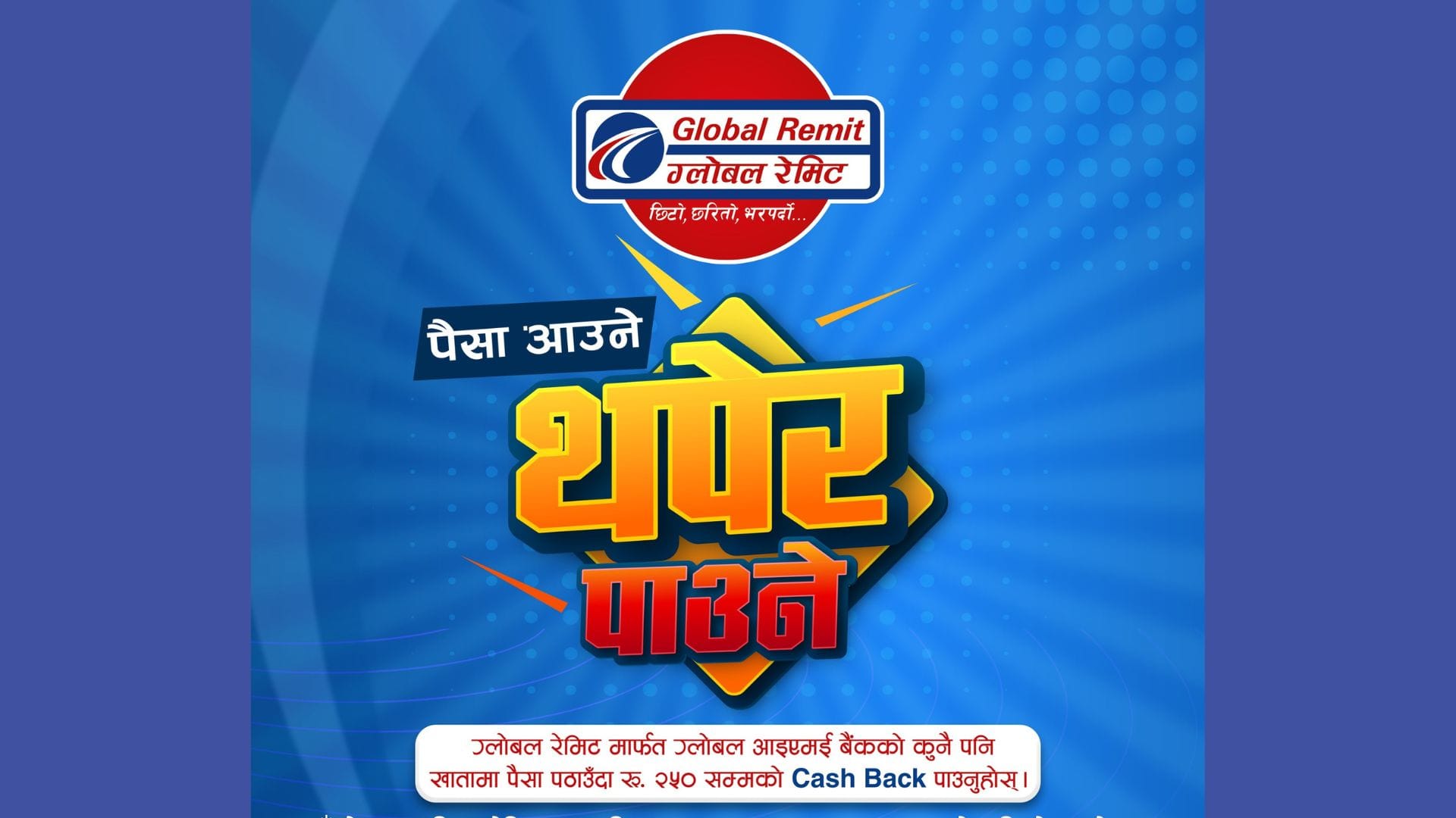 काठमाडाैं । ग्लोबल आइएमई बैंक लिमिटेडले ग्लोबल रेमिटमार्फत विदेशबाट पैसा पठाउँदा २५० रुपैयाँसम्म क्यासब्याक पाइने नयाँ योजना सार्वजनिक गरेको छ । पैसा आउने, थपेर पाउने नारा सहित सार्वजनिक गरेको क्यासब्याक योजनामा ग्लोबल रेमिटमार्फत विदेशबाट ग्लोबल आइएमई बैंकमा रहेको खातामा पैसा पठाउँदा २५० रुपैयाँसम्मको क्यासब्याक पाइनेछ ।