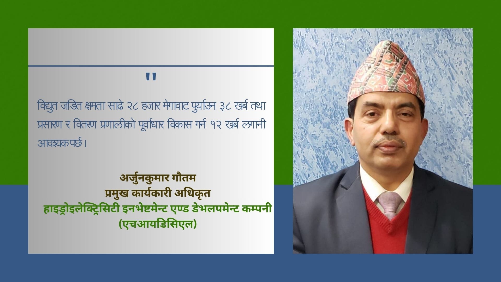 (अर्जुनकुमार गौतम एचआइडिसिएलका प्रमुख कार्यकाकारी अधिकृत हुन् । उनकाे याे लेख स्वतन्त्र ऊर्जा उत्पादकहरूको संस्था, नेपाल (इपान) ले हालै प्रकाशित गरेकाे ऊर्जा समृद्धि नामक स्मारिकाबाट साभार गरिएकाे हाे । )