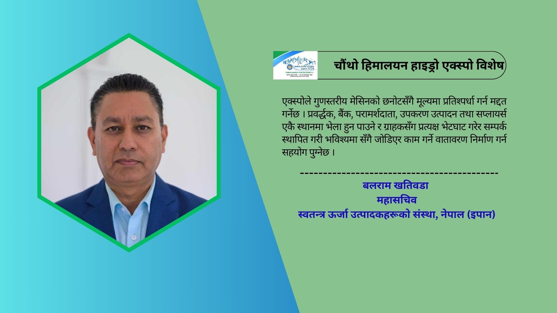 यसपटकको हाइड्रो एक्स्पो विगतको ३ वटा एक्स्पोको तुलनामा अझै विशेष बनाउन हाम्रो प्रयास हुनेछ । यो हाइड्रो एक्स्पोमा पनि लगानीकर्ता, बैंक, निर्माण उपकरण एवं मेसिनरी उपकरण उत्पादक, परामर्शदाता सबै एकै स्थानमा सम्पर्कमा आउनेछन् । सबैको एकअर्कामा परिचय हुन्छ । सम्पर्क स्थापित हुन्छ । यसले प्रवद्र्धकलाई अवश्य पनि फाइदा पुग्नेछ । साथसाथै, उपकरण सप्लायरका मेसिन तथा नयाँ प्रविधि प्रदर्शन गर्न ल्याउनेलाई पनि मार्केटिङ गर्न सहज हुनेछ । त्यसकारण, यसपटकको एक्स्पो पनि सबैका लागि सम्पर्क विन्दु बन्न सफल हुनेछ भन्ने विश्वास लिएका छौं ।