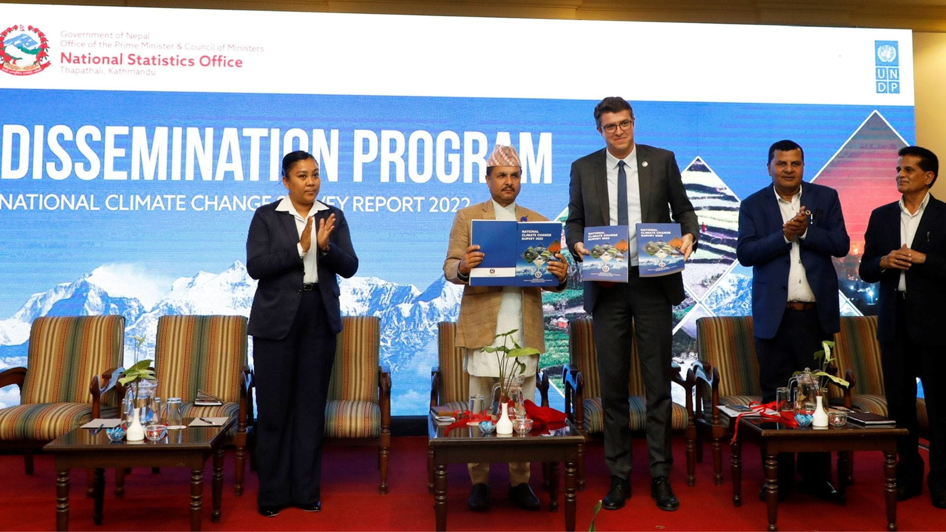 काठमाडौं । केन्द्रीय तथ्याङ्क कार्यालयले मुलुकको हिमाल, पहाड र तराईको वस्तुस्थितिमा आधारित भई तयार पारेको राष्ट्रिय जलवायु परिवर्तनसम्बन्धी प्रतिवेदन सार्वजनिक गरेको छ । संयुक्त राष्ट्र सङ्घीय विकास कार्यक्रम (युएनडिपी) को सहयोगमा २९ जिल्लाका ६ हजार ५ सय घर परिवारमा पुगी तयार पारिएको सो प्रतिवेदन प्रमुख तथ्याङ्क अधिकारी अर्जुनप्रसाद पोखरेल र नेपालस्थित युएनडिपीका आवासीय उपप्रमुख जुलियन सेभिलार्डले साेमबार सार्वजनिक गरेका हुन् ।