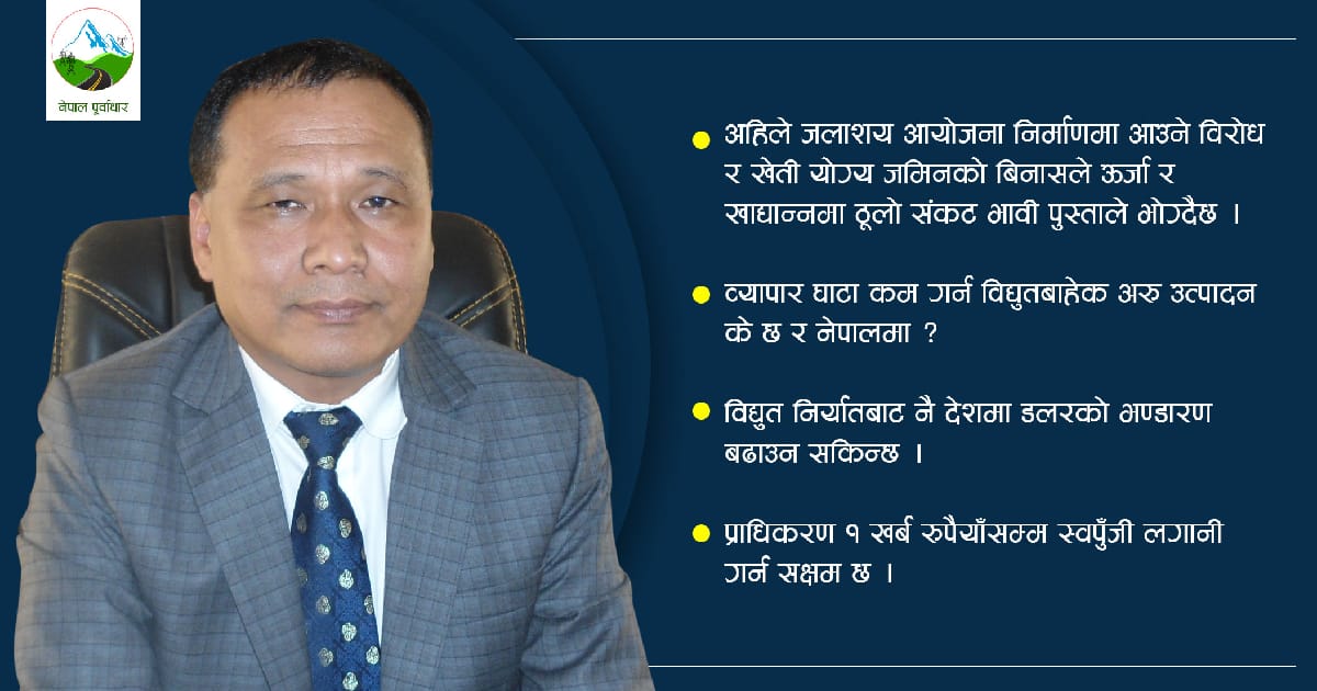 अहिले न समय धेरै बितिसकेको छ । अब भने ढिला र अलमल नगरी काम गर्ने हो भने अझै पनि भविष्यमा ठूलो परिमाणमा विद्युत निर्यात गर्न सकिन्छ भन्ने लाग्छ । राजनितिक दलले धेरै कुरा बुझ्दैनन् । तर, हामी बुझेको मान्छेले त बुझाउन सक्छौं नि । निर्यात गर्ने भन्ने वित्तिकै गलत धारणा बनाएर हुन्छ र ? आत्मनिर्भर हुनुको सट्टा हाम्रो परनिर्भरता दिन दिनै बढीरहेको छ ।