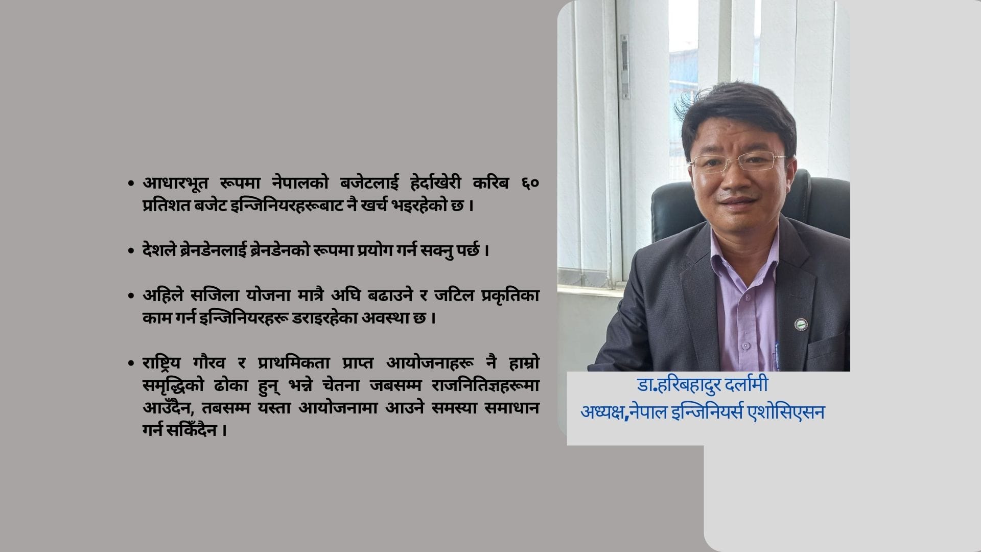 आधारभूत रुपमा नेपालको बजेटलाई हेर्दाखेरी लगभग ६० प्रतिशत बजेट इन्जिनियरहरुबाट नै खर्च भइरहेको छ । यो हेर्दा पनि मुलुकको विकास निर्माणमा इन्जिनियरहरुको भूमिका कस्तो छ भन्ने कुरा दर्साउँछ । तर, देशको पूर्वाधार निर्माणमा जुन रुपमा खर्च गर्नुपर्ने हो । सरकारले सोही अनुसार आयोजनाहरुलाई अगाडी बढाउन सकिरहेकोे भने छैन् । विशेषगरी काममा ढिलासुस्ती (टाइम डिल), गुणस्तरीय काम लगायतका विषयवस्तु रहेका छन् । हामीहरुले तालिम र व्यक्तिगत क्षमता अभिवृद्धिको कुराहरु सम्पूर्ण कार्यक्रमको प्याकेजहरु अगाडी बढाउँदै गर्दाखेरी सम्पूर्ण पूर्वाधारका कार्यक्रमहरुलाई समेट्दै अघि बढिरहेका छौं । यी र यस्तै खालका कार्यक्रमले दूरगामी रुपमा सकारात्मक परिणाम निस्कने हामीेले अपेक्षा गरेका छौं ।