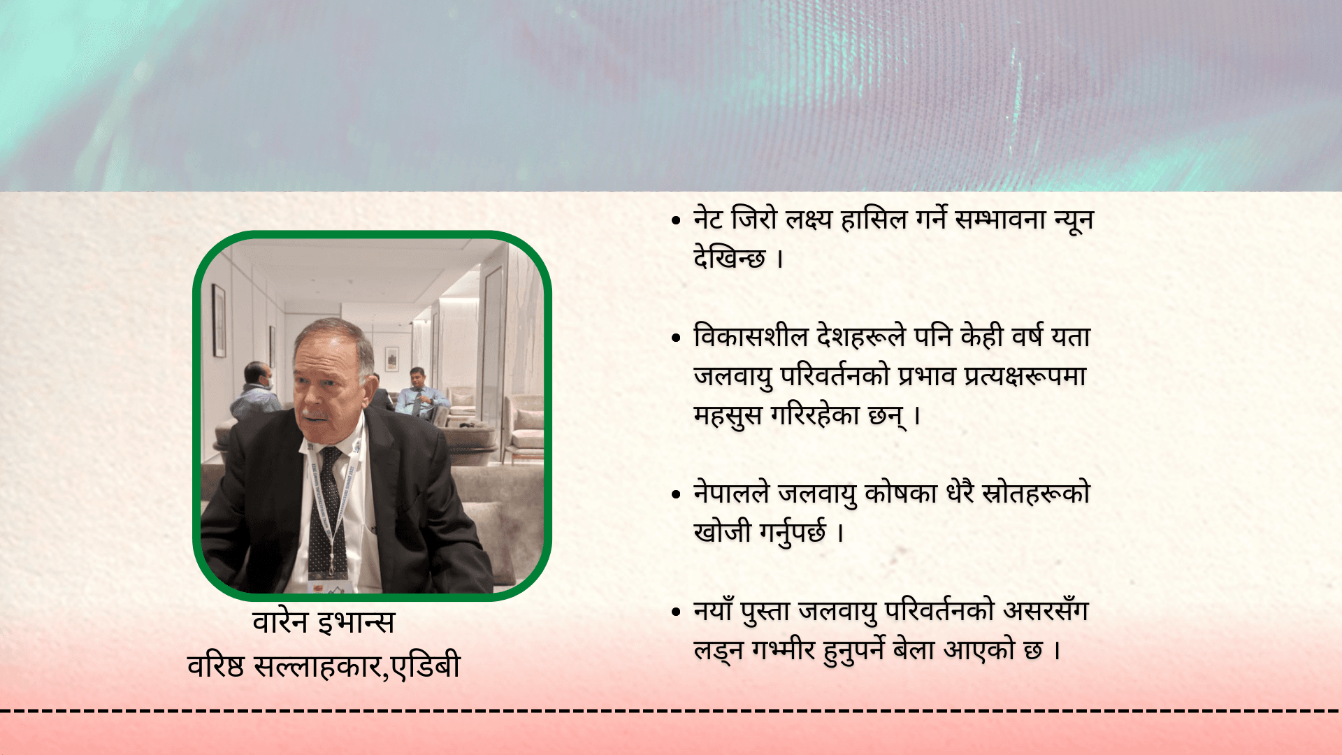 वारेन इभान्स एसियाली विकास बैंक (एडिबी)का अध्यक्षको कार्यालयका वरिष्ठ सल्लाहकार (जलवायु परिवर्तन) हुन् । उनीसँग विभिन्न वित्तीय संस्थाहरू, निजी संस्थाहरू तथा अन्य ठूला एजेन्सीहरूमा आबद्ध भई काम गरेको लामाे अनुभव छ । उनले दिगो विकास र जलवायु परिवर्तनको क्षेत्रमा ४० वर्षभन्दा बढी समय व्यथित गरेका छन् । नेदरल्याण्डको रोटरडमस्थित इरास्मस विश्वविद्यालयबाट ‘सफा उत्पादन तथा जलवायु परिवर्तन नीति’ विषयमा विद्याबारिधी (पिएचडी) गरेका उनीसँग वातावरणीय स्वास्थ्य इन्जिनियरिङ र पर्यावरण सम्बन्धित शैक्षिक पृष्ठभूमि छ । काठमाडाैंमा गत शुत्रबार सम्पन्न नेपाल पूर्वाधार सम्मेलन २०२२ को चौंथो संस्करणमा सहभागी हुन नेपाल आएको अवसरमा उनीसँग नेपाल पूर्वाधार डटकमका सम्पादक भीम गौतमले हरित पूर्वाधार तथा जलवायु परिवर्तनको प्रभाव न्युनिकरणलगायत विविध विषयमा गरेको कुराकानीको संक्षिप्त सारः