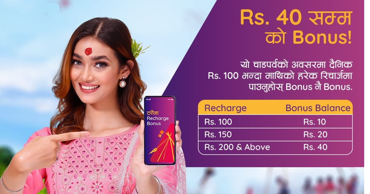 एनसेलले ल्यायो दशैं रिचार्ज बोनस, १ सय माथिको हरेक रिचार्जमा बोनस ब्यालेन्स